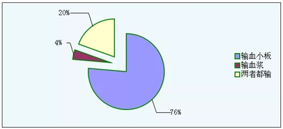 選擇我院2013年1月至2015年7月期間臨床醫生為內科、外科、急診、手術患者中臨床單純輸注血小板和(或)血漿后再次做血栓彈力圖檢測進行比對且Angel角值正常的患者人數是2345人(由于討論的是輸注血小板和(或)血漿對臨床輸血的指導作用,所以要求匯總統計的患者其Angel角的數值是正常的,排除了纖維原對患者凝血功能的干擾)。 臨床單純輸注血小板和(或)血漿后再次做血栓彈力圖檢測進行比對的2345名患者中有1791名只輸注血小板的患者,占總人數人數的76.38%;有458名同時輸注血小板和血漿的患者,占總人數19.53%;有96名是只輸血漿的患者,占總人數的4.09%(圖1表示)。